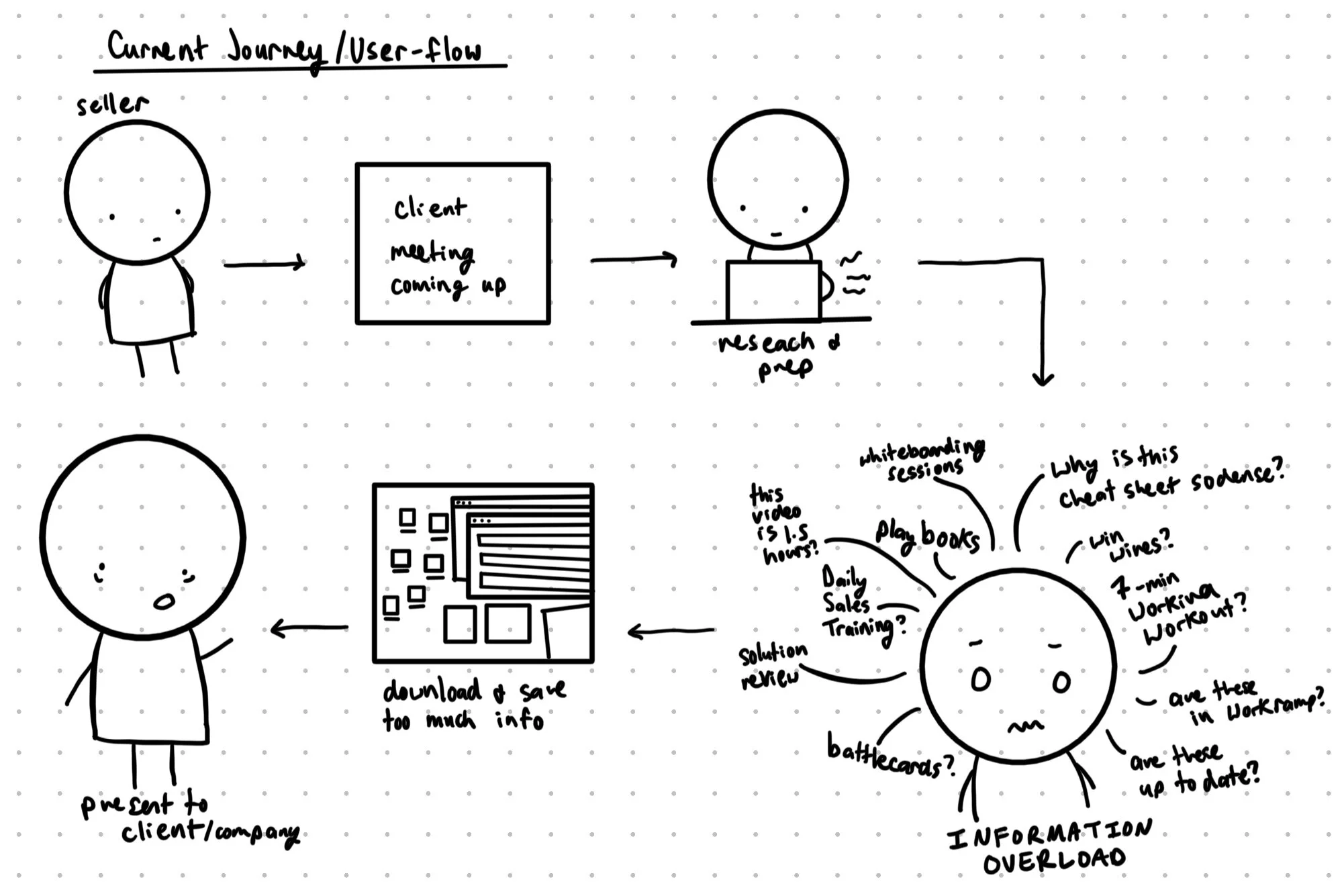 This image demonstrates the current process of what Workiva sellers need to go through if they want to find information to prepare for client and company meetings. There are resources scattered across Workramp (Workiva’s LMS system), the Connect portal (which has now been shut down and the information is in the middle of being transferred), and countless shared files within the Sales and Workiva Wdesk spaces. If a seller wanted to find a quick guide to refer to to prepare for meetings, the available “cheat sheets” are so overloaded with information that it can not possibly qualify as a quick reference. Thus, it is up to sellers to determine their own work flow and to filter through heaps of information.